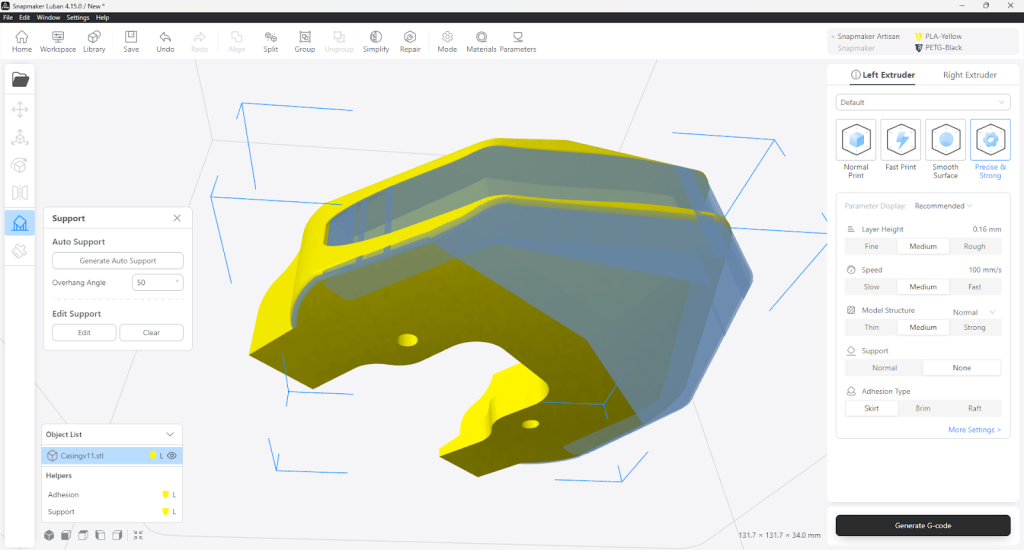 Despite the surface issues, the Artisan completed the print without interruption. The breakaway supports detach easily by hand, leaving smooth, well-defined interface surfaces. Overhang undersides showed consistent layering with minimal scarring or tearing after support removal.